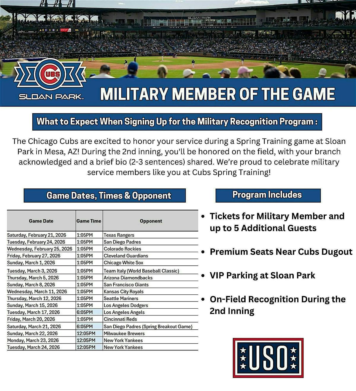 Register Now for the opportunity to be the Military Member of the Game. The Chicago Cubs are excited to honor your service during a Spring Training game at Sloan Park in Mesa, Arizona. During the 2nd inning, the service member will be honored on the field, with your branch acknowledged and a brief bio (2-3 sentences) shared. The opportunity is available to ONE service member per game and up to 5 of their additional guests. This includes premium seats near the Cubs Dugout, VIP Parking at Sloan Park and on field recognition during the 2nd inning.