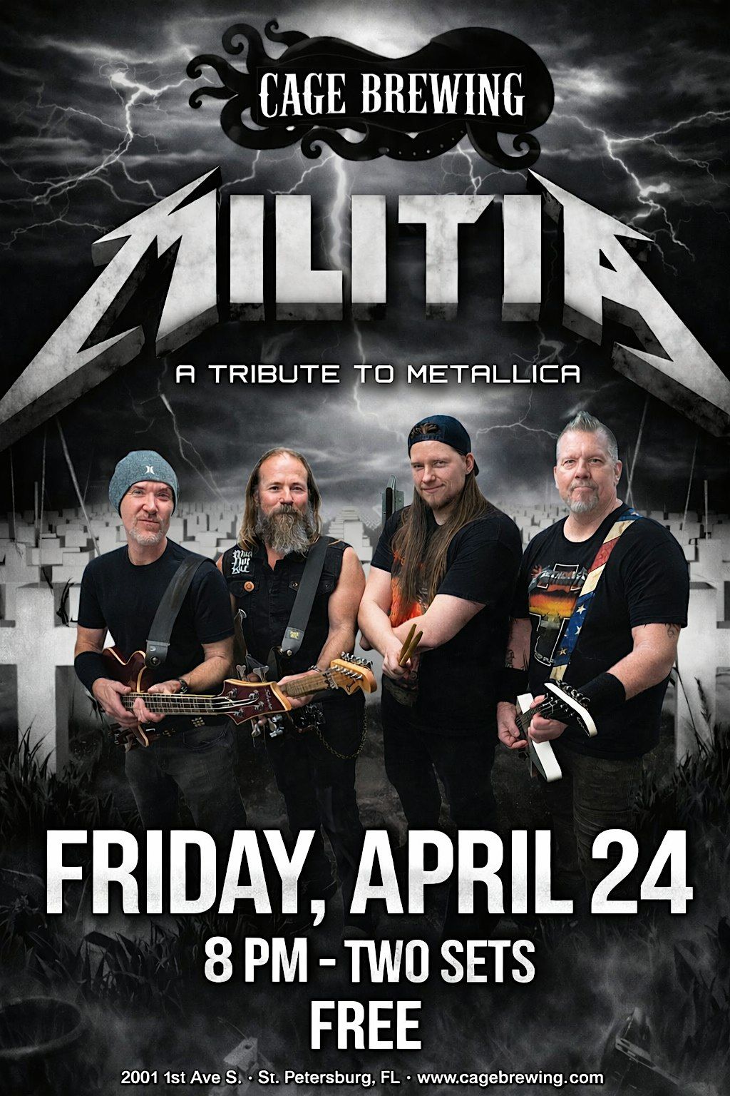 Get ready, St. Pete! MILITIA is hitting Cage Brewing for an unforgettable night of metal madness. Dive into classic Metallica tunes played with raw energy and passion. This is in-person and totally FREE. Bring your crew, grab a brew, and rock out with the best local tribute band around. Don’t miss this epic metal experience right in the heart of St. Pete, FL!