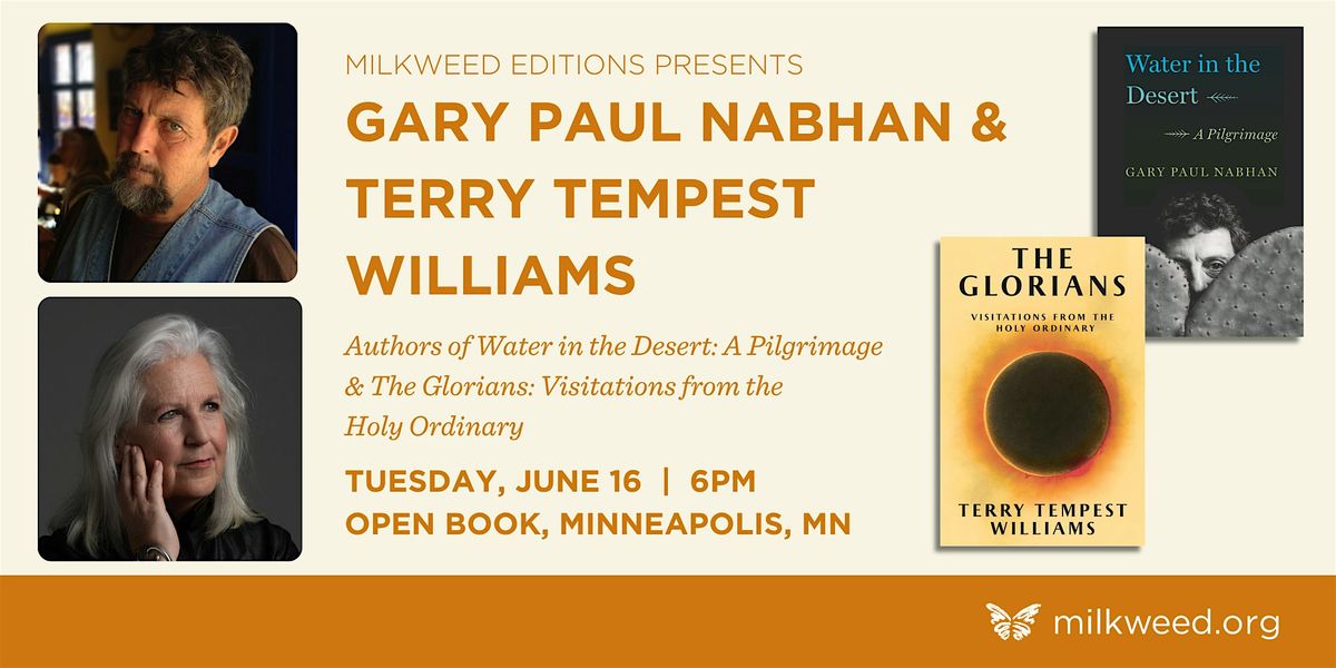 Join Milkweed Editions as we present Gary Paul Nabhan and Terry Tempest Williams at Open Book. Both authors will read from their newest collections, engage in conversation and audience Q+A, and book signings. See below for information on the newest books. Space will be limited, so please register here and let us know if you can’t make it.