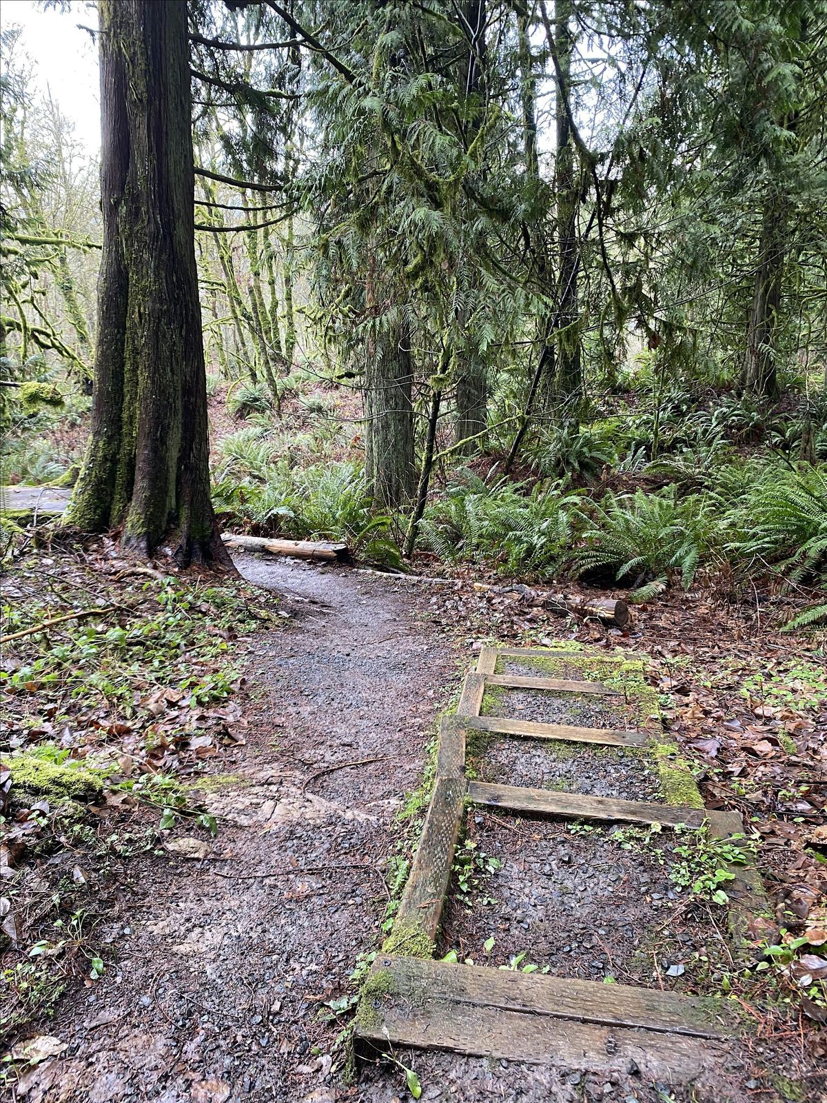 The Maple Ridge Trail is a 2.5 mile loop hiking trail that meanders through forest. The section where we will be working was impacted by a large landslide in 2008, and has been challenging to maintain. Currently, users have creatd a tral that runs parallel to a set of stairs on the trail. There are some options that we are considering as ways to improve the 100' section of trail. We'll be working in this area to make it more user friendly.