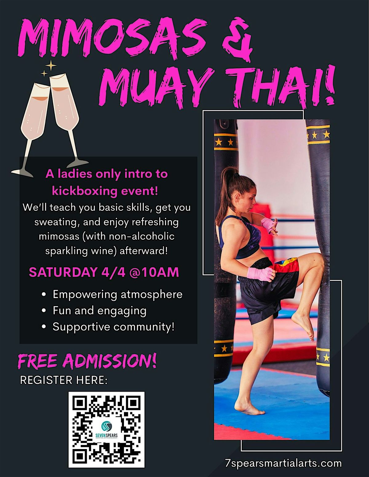 Join us for an exciting day of kickboxing where you'll learn the fundamentals while having an absolute blast! 💥 We'll teach you basic skills, get your heart pumping, and afterwards, enjoy refreshing mimosas (with non-alcoholic sparkling wine!) to unwind together! 🥂