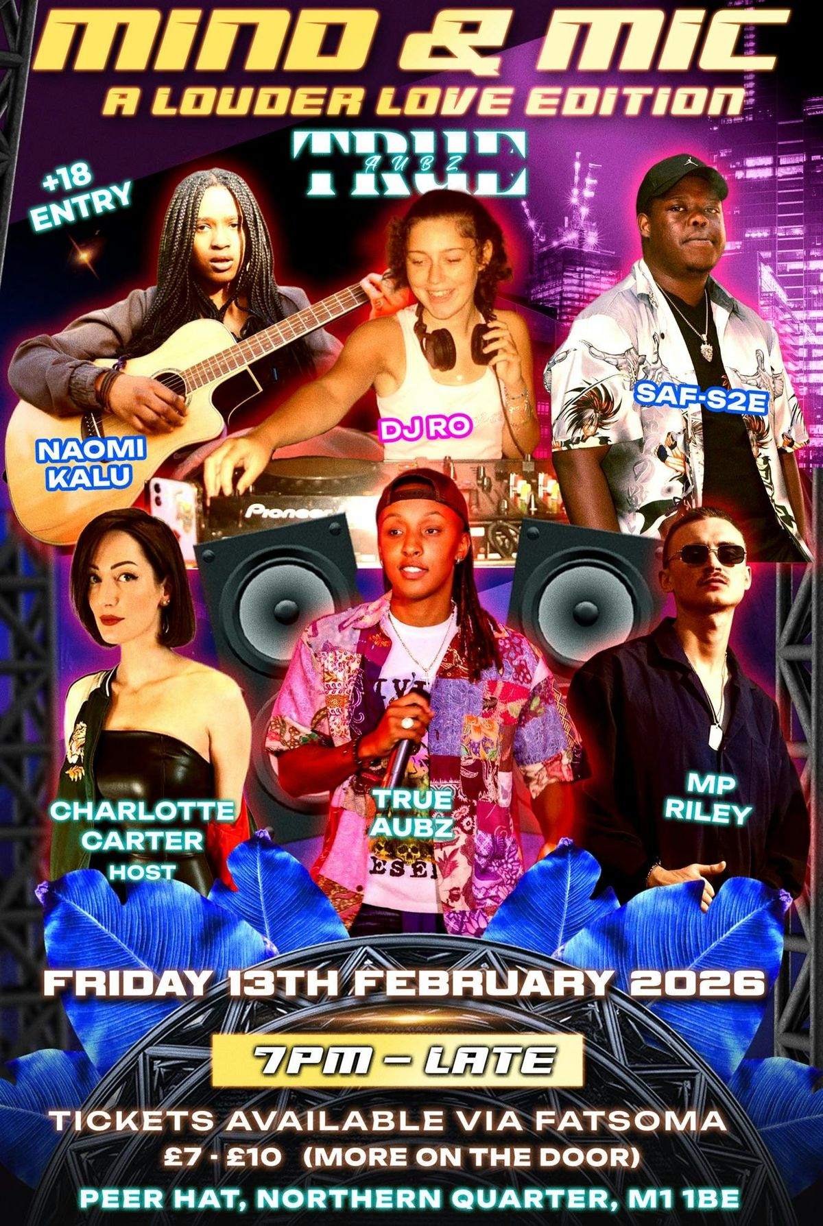 Welcome back to the 1st Mind & Mic of 2026. Curated by Manchester's very own female rapper True Aubz. We are back with 'A louder love' edition. Celebrating and embracing the individuality of each attendee through showcasing , networking and real conversation. Hosted by Unity radios Charlotte Carter who will be sure to add a sprinkle of good vibes. On the night we have a fantastic selection of artist's. This includes Naomi Kalu , Saf-S2E and MP Riley. Performing original pieces of music from multiple genres. ranging from R&b , hip-hop , alterative and indie music. Handling the decks we will have the sweetest Dj-Ro keeping us in the mix with songs that will take you back in time and others that will have you updating playlist.in advance we appreciate everyone who will be attending. Thank you for purchasing a ticket , see you then.