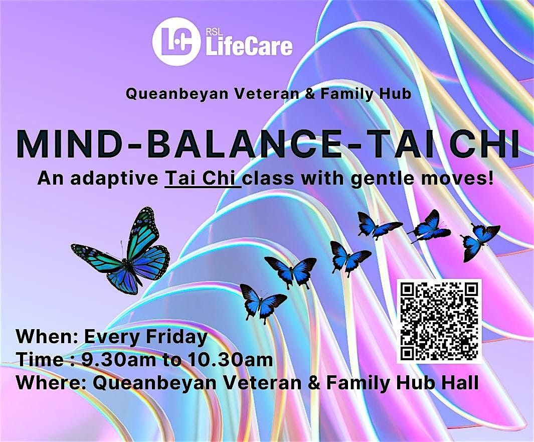 Join us each Friday from 9:30-10:30am for a gentle Tai Chi movement class, at the Queanbeyan Veteran & Family Hub.