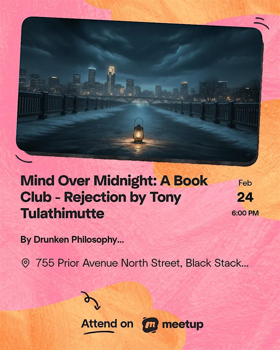 For this Mind Over Midnight gathering, we’ll confront Tony Tulathimutte’s , a darkly unsettling exploration of loneliness, entitlement, and the emotional wreckage of modern connection. These stories dissect rejection not as a singular event, but as a defining condition of contemporary life filtered through dating apps, resentment, desire, and self-deception. Tulathimutte forces us to sit with uncomfortable perspectives, asking whether empathy has limits and what happens when wounded egos turn corrosive. As we meet, we will examine where responsibility ends, where bitterness begins, and how rejection reshapes identity.