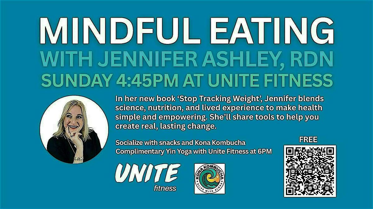 Join author and Registered Dietitian Jennifer Ashley this Sunday 445PM at Unite Fitness as she shares insights from her new book Stop Tracking Weight: A 59-Day Journey to Mindful Eating. Enjoy a talk, Q&A, snacks, Kona Kombucha, and a special book offer ($14.99). Plus, all attendees are invited to free Yin Yoga at 6PM with Unite Fitness. Sign up for FREE via Mindbody - https://tinyurl.com/Unite-Mindful-Eating