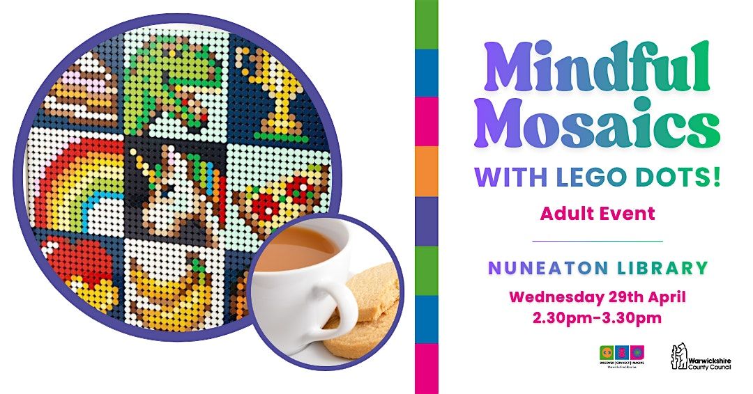 Slow down and get creative with Mindful Mosaics with LEGO DOTS, a relaxing session, designed for adults, taking place at Nuneaton Library on Wednesday 29 April 2026, from 2.30pm to 3.30pm.
