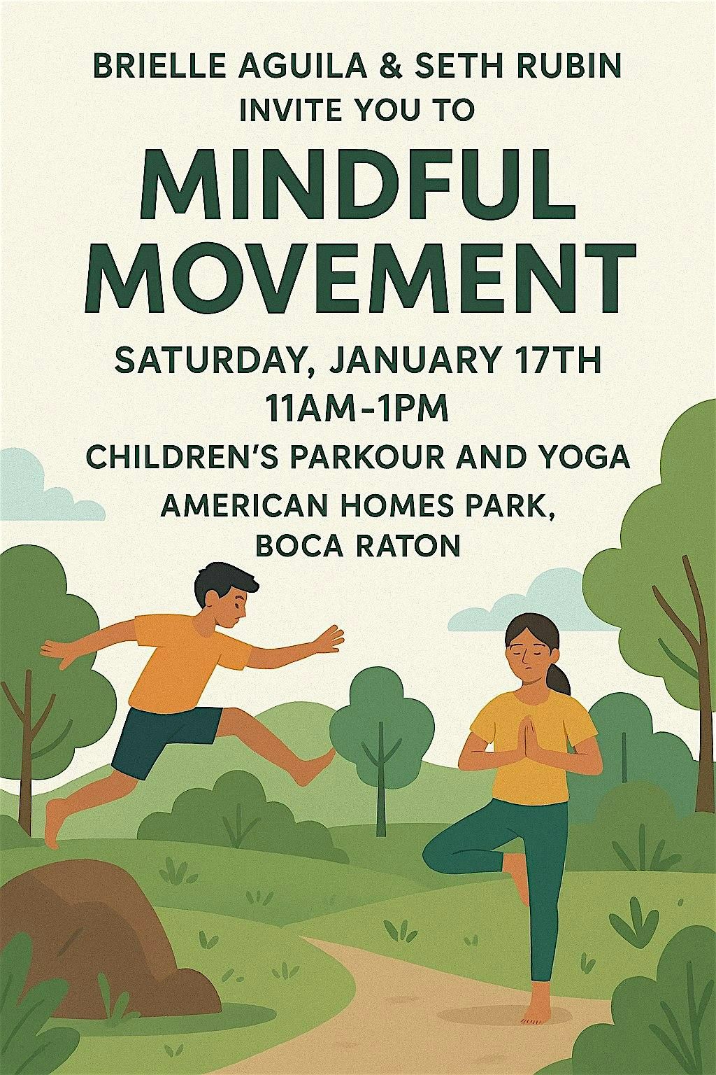 My friend Brielle and I are hosting a childrens movement event at American Homes Park in Boca Raton. I will teach the kids how to safely jump, climb and explore. Brielle will lead them through a yoga practice to unwind and go within.