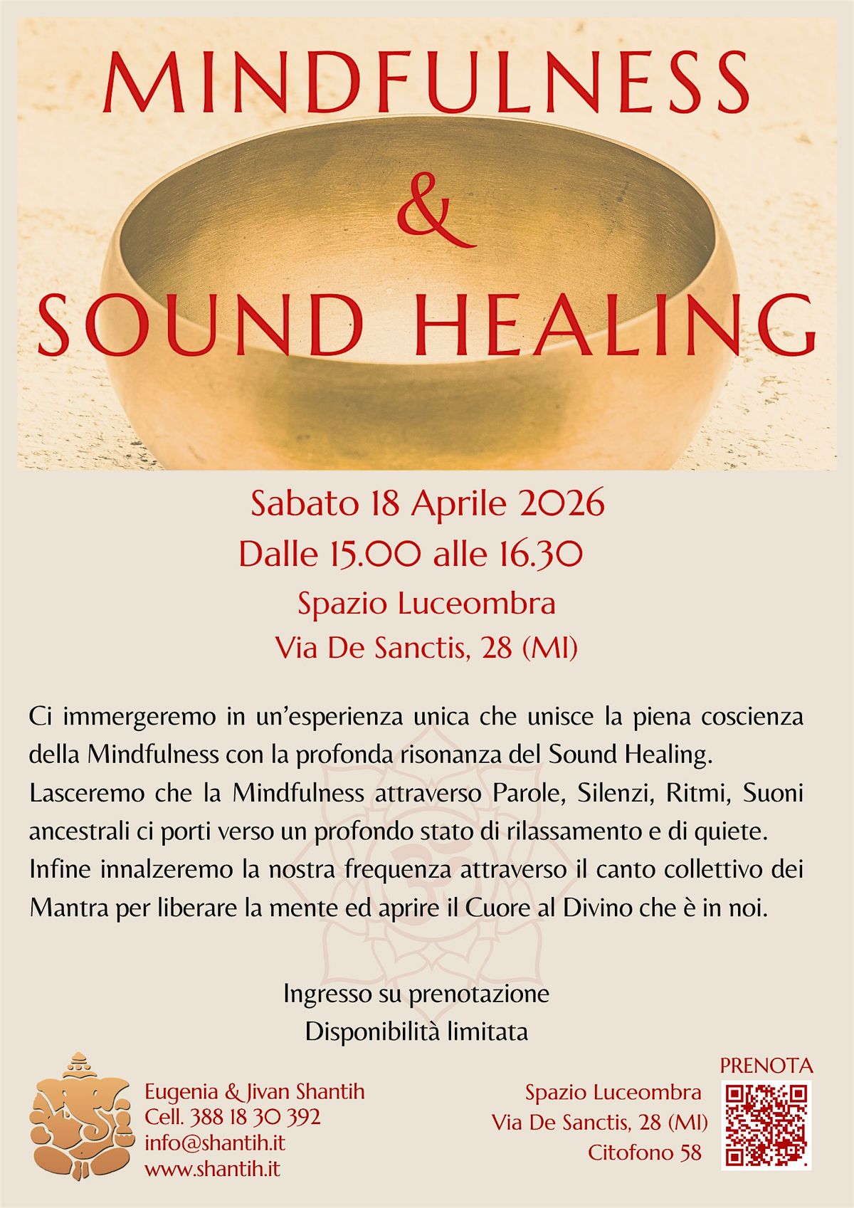 Lasceremo che la Mindfulness attraverso Parole, Silenzi, Ritmi, Suoni ancestrali ci porti verso un profondo stato di rilassamento e di quiete per acqusire nuove energie di rinnovamento. L’esperienza sarà colmata da un bagno sonoro e dalle vibrazioni curative di strumenti Ancestrali. Infine, per chi vorrà, innalzeremo la nostra frequenza attraverso il canto collettivo dei Mantra per liberare la mente ed aprire il Cuore al Divino che è in noi.