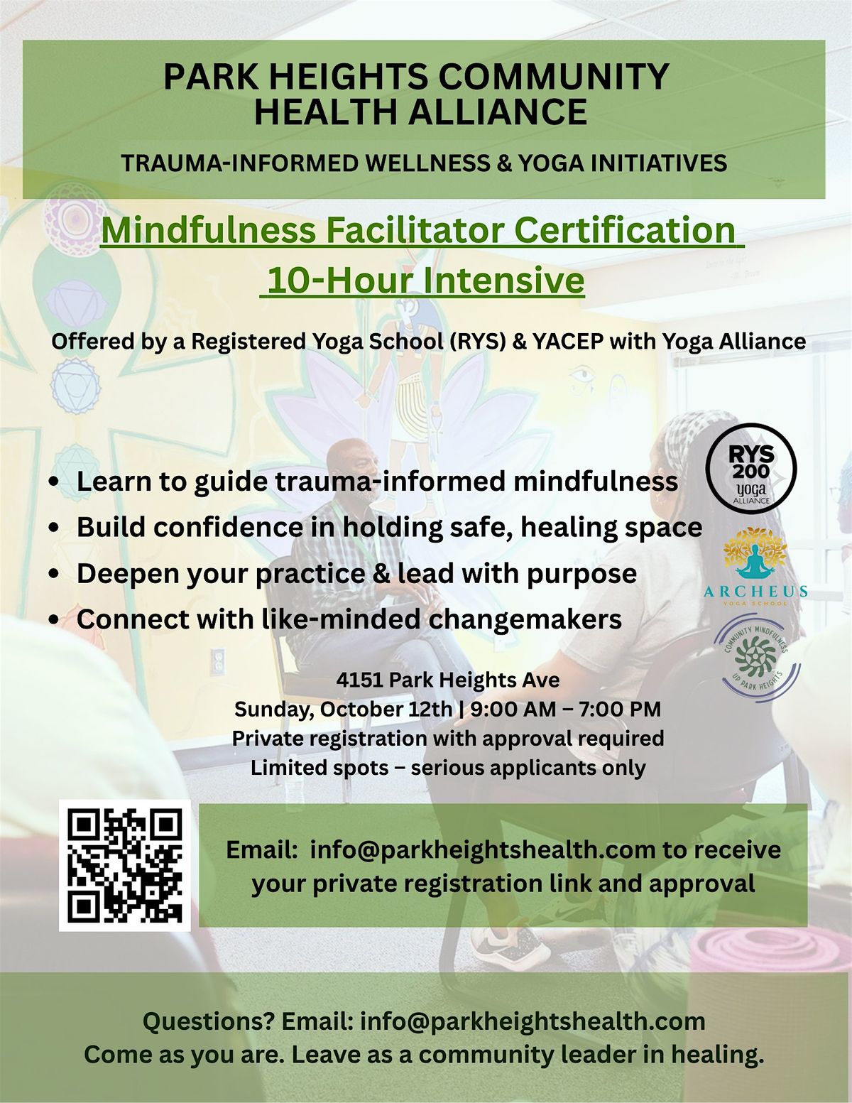Are you passionate about mindfulness and want to deepen your practice? Join us for our 10-hour intensive certification program! Learn from experienced instructors and gain the skills needed to guide others in mindfulness practices. This in-person event will be held at 4151 Park Heights Ave. Don't miss this opportunity to become a certified mindfulness facilitator!