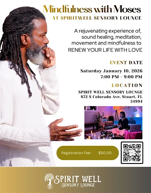 We invite you to join us on Wednesday, August 27th from 7:30 to 9 PM for Mindfulness With Moses. This event will be hosted at the Spirit Well Sensory Lounge at 872 South Colorado Avenue, Stuart, FL 34994. During this event, Moses will lead attendees in meditation, mindful conversations, sound healing, yoga movement, and more!