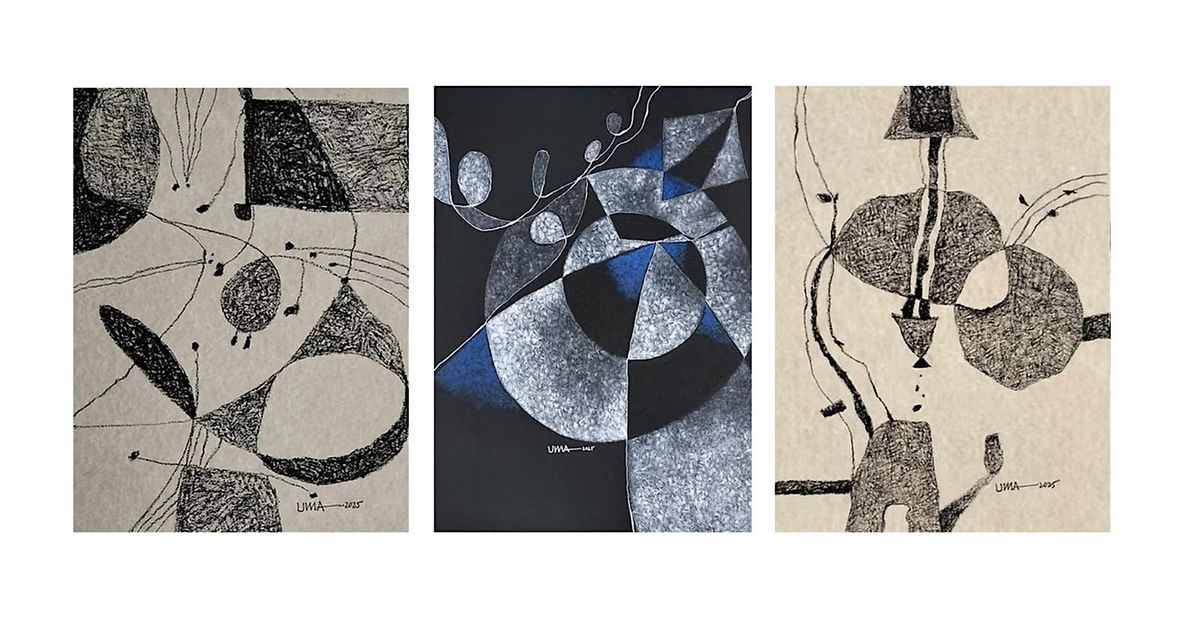From early in life, the human mind learns to categorize what it sees—shapes, colors, and patterns—placing them into familiar frameworks. Through this body of work, Uma explores what happens when those frameworks are set aside. Her creative process becomes a quiet negotiation with the mind and ego, allowing the subconscious to guide the movement of the hand. The resulting works unfold freely, without rigid rules or expectations.