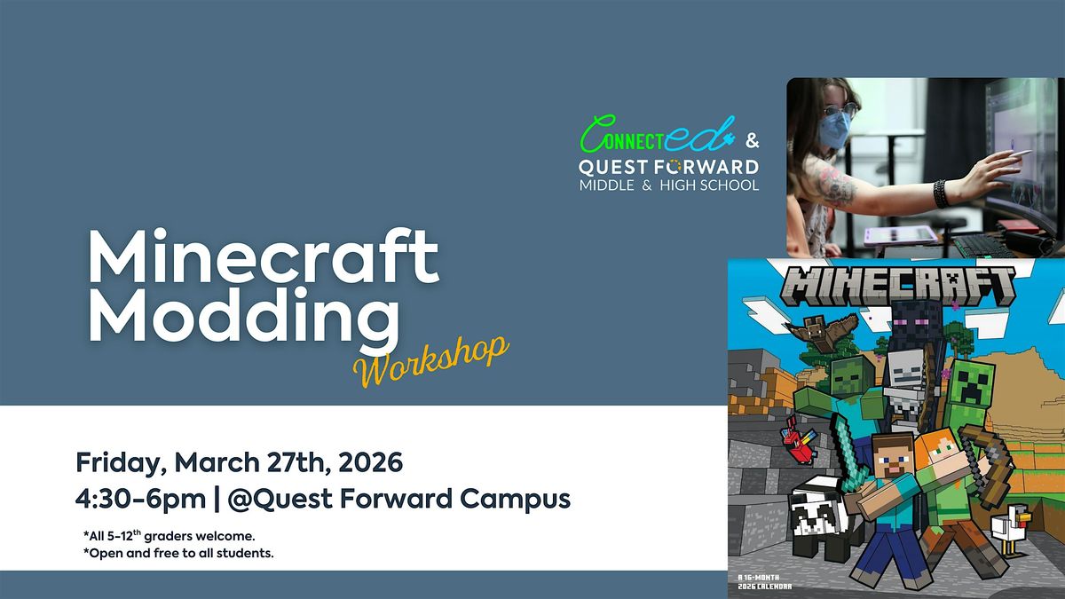 ConnectED and Quest Forward Middle and High School are excited to host a hands-on Minecraft Modding Workshop where students learn how games are built, not just played. Using provided computers, students will dive into Minecraft modding, 3D modeling, and beginner-friendly coding tools in a fun, collaborative environment.