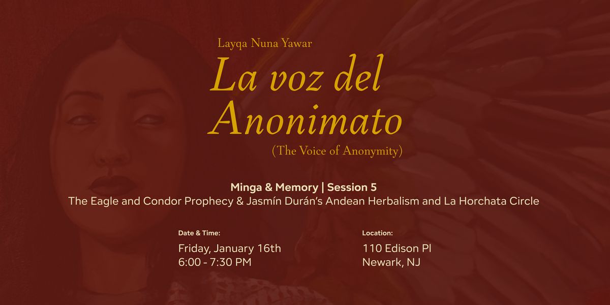 On Friday, January 16th, 6:00–7:30 PM, join us for Session 5: The Eagle and Condor Prophecy & Jasmín Durán’s Andean Herbalism and La Horchata Circle. We close out our series of conversations and the exhibition with a short presentation on the Prophecy of the Eagle and Condor as medicine and a guide for the Andean diaspora living on northern Native lands. Closing the event, we will be joined by herbalist Jasmín Durán for a multigenerational conversation about La Horchata -- a traditional herbal drink popular in southern Ecuador, best known for its vibrant red hue! We'll be sharing stories, recipes, and learning about the medicinal properties of the herbs traditionally used in this beloved Ecuadorian drink. Together, we'll prepare two versions of horchata to enjoy in the community.