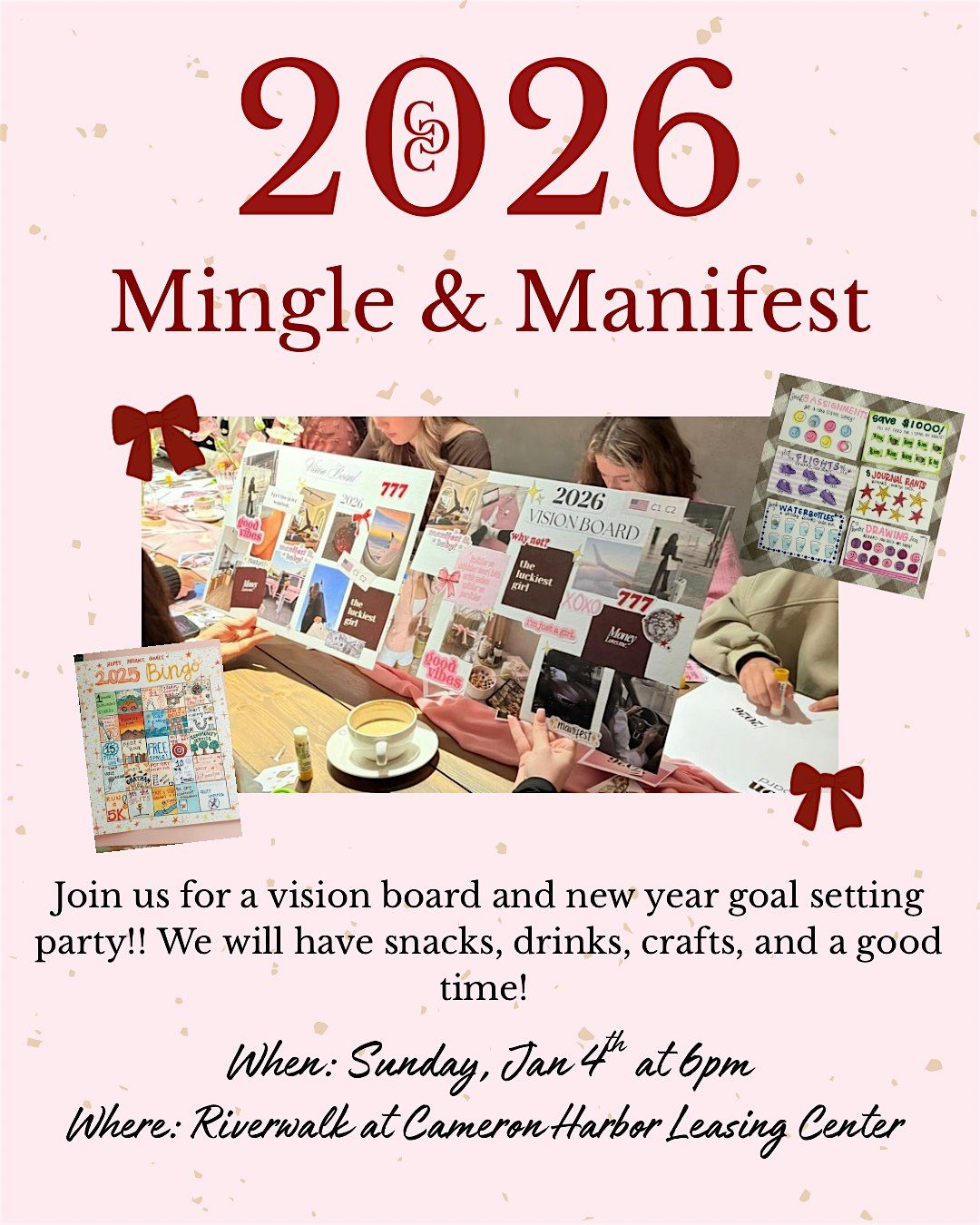 Welcome to the Mingle & Manifest Party 2026 at Riverwalk at Cameron Harbor! Get ready for a night of connection and positive vibes on Jan 4th, 2026 at 6:00 PM. Join us for an evening filled with laughter, crafting, and manifesting your dreams. Let's come together, mingle with like-minded individuals, and set our intentions for the future. Don't miss out on this opportunity to make new friends and bring your dreams to life. See you there! (Eastern Time)