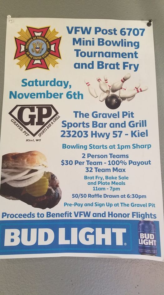 VFW Mini Bowling Tournament & Brat Fry2 person teams/$30 per team