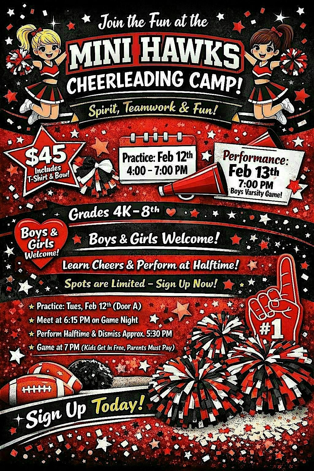 This is the perfect chance for young athletes to learn cheerleading basics, build confidence, and shine on the field during halftime! Spots are limited—don’t miss out!
