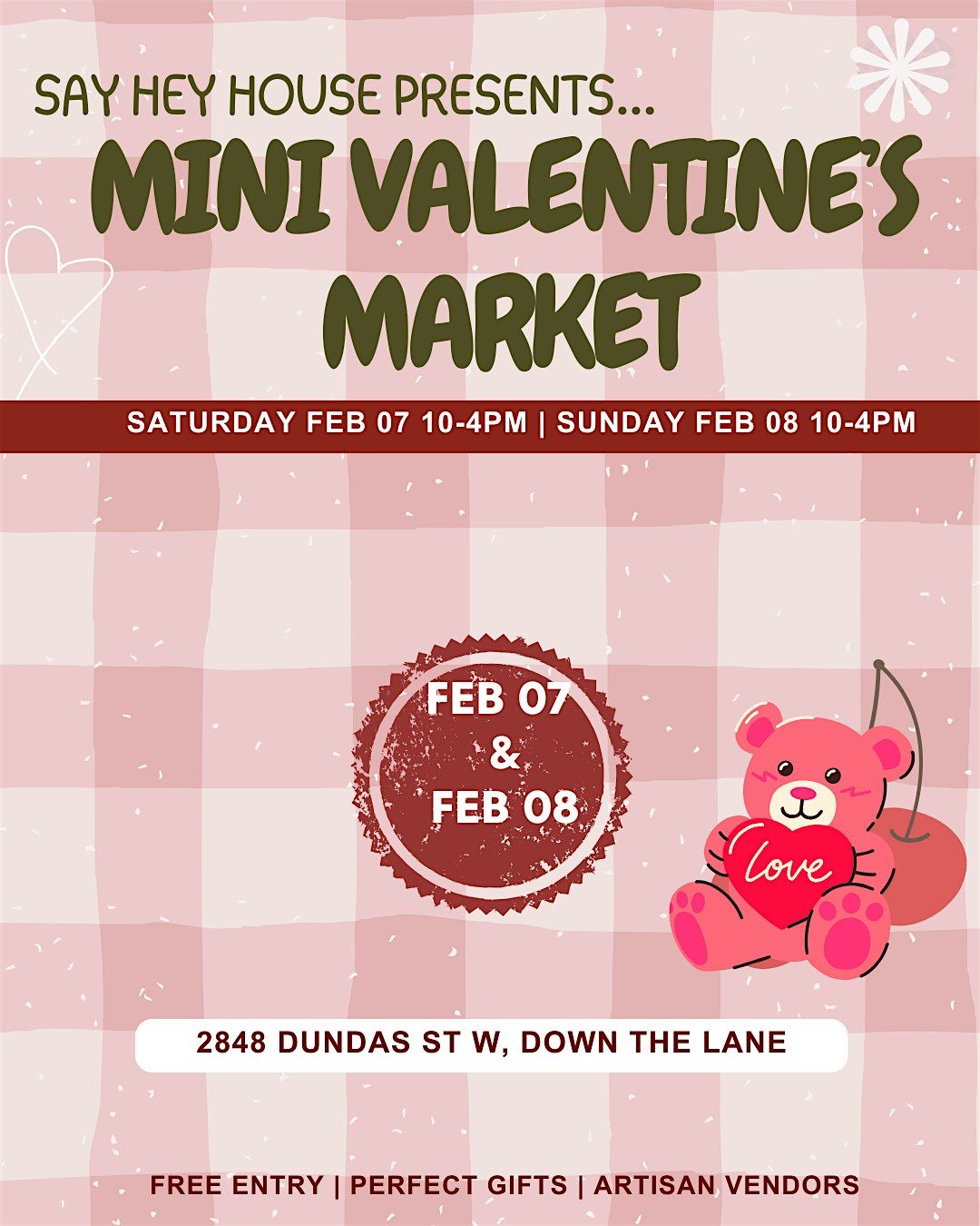 Hey there! Join us for the Valentine's Mini Market at Say Hey House on February 7th & 8th, 2026 from 10:00 AM-4:00 PM.