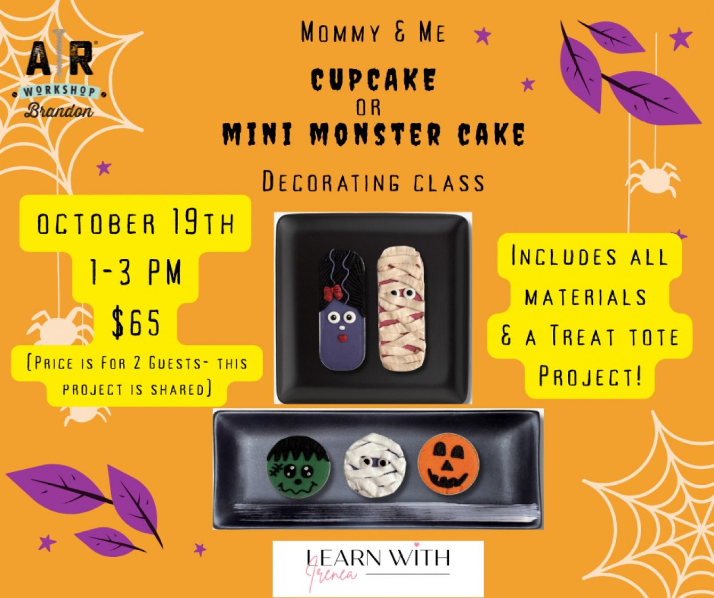 Get ready for a deliciously creative experience! Join us for a hands-on Cupcake or Mini Monster Cake Decorating Workshop where you'll craft decorate and take home your own sweet creations. Your kiddo will get to paint their own Treat Tote for their upcoming trick or treat adventures!