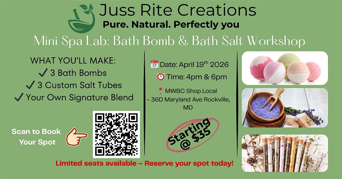 Join Juss Rite Creations for a hands-on DIY bath bomb and bath salt workshop where youβll create your own custom spa products using natural ingredients.