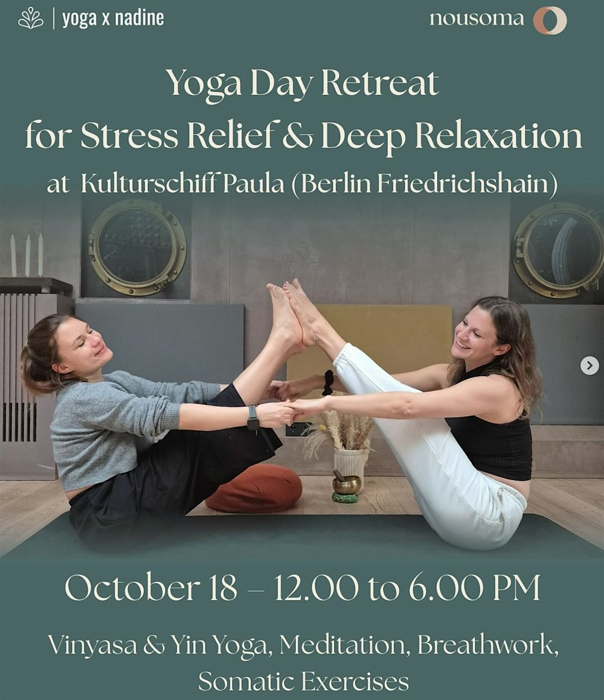 Mini yoga time-outs ("Day Retreats") for beginnersWe begin the day with a gentle check-in, followed by grounding breathwork and meditation to arrive fully in the moment. Somatic exercises and a flowing Vinyasa practice help release physical tension and reconnect with the body. After a nourishing break, we explore stress management and mindfulness tools, along with simple practices to integrate into everyday life. Emotional reflection and a symbolic burning ritual offer space for release. A guided meditation leads you to your inner place of calm, and a deeply restorative Yin Yoga session supports relaxation and nervous system balance. We close the day feeling grounded, relaxed, and recharged.At 12:00, we begin with a gentle check-in to arrive fully in the space and with each other. This is followed by an arrival session including calming pranayama and grounding meditation, helping to settle the nervous system and ease into a slower rhythm. At 12:30, we explore somatic exercises to increase body awareness and release stored tension, preparing us for a revitalizing Vinyasa Flow session at 12:45. This dynamic practice supports the release of physical and mental stress through movement and breath.After the session, we take a nourishing lunch break at 14:00 to recharge. At 14:30, we shift into a theory session on stress management and mindfulness, exploring how stress manifests in the body and mind, and which simple yet effective tools we can integrate into our daily lives. You’ll receive take-home practices to continue your journey beyond this day.At 15:15, we connect with our emotions using emotion cards and close with a symbolic burning ritual on the deck—a mindful letting-go practice. A coffee and tea break follows at 16:00, allowing for rest and quiet exchange.We return at 16:15 for a guided meditation journey to your inner place of relaxation, creating a personal anchor of calm you can revisit any time. The day closes with a deeply restorative Yin Yoga session at 16:45, supporting emotional release and nervous system regulation. We end the retreat gently with a closing circle and check-out at 17:45.Booking: https://www.firmenyogamitnadine.de/day-retreats/kommende-termine-upcoming/