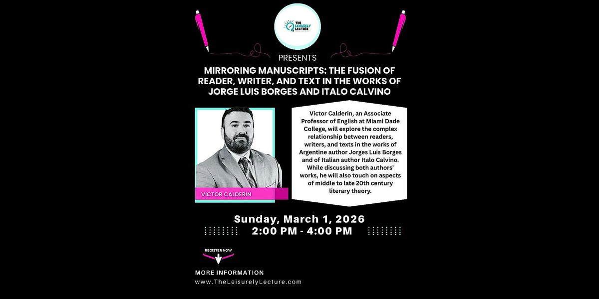 Victor Calderin’s life as a reader began in early childhood, setting him off on an odyssey through books that led him to study comparative literature at the University of North Carolina at Chapel Hill and to serve in his role as Associate Professor of English today at Miami Dade College. In this talk, he will explore the complex relationship between readers, writers, and texts in the works of Argentine author Jorges Luis Borges and of Italian author Italo Calvino. While discussing both authors’ works, he will also touch on aspects of middle to late 20th century literary theory.