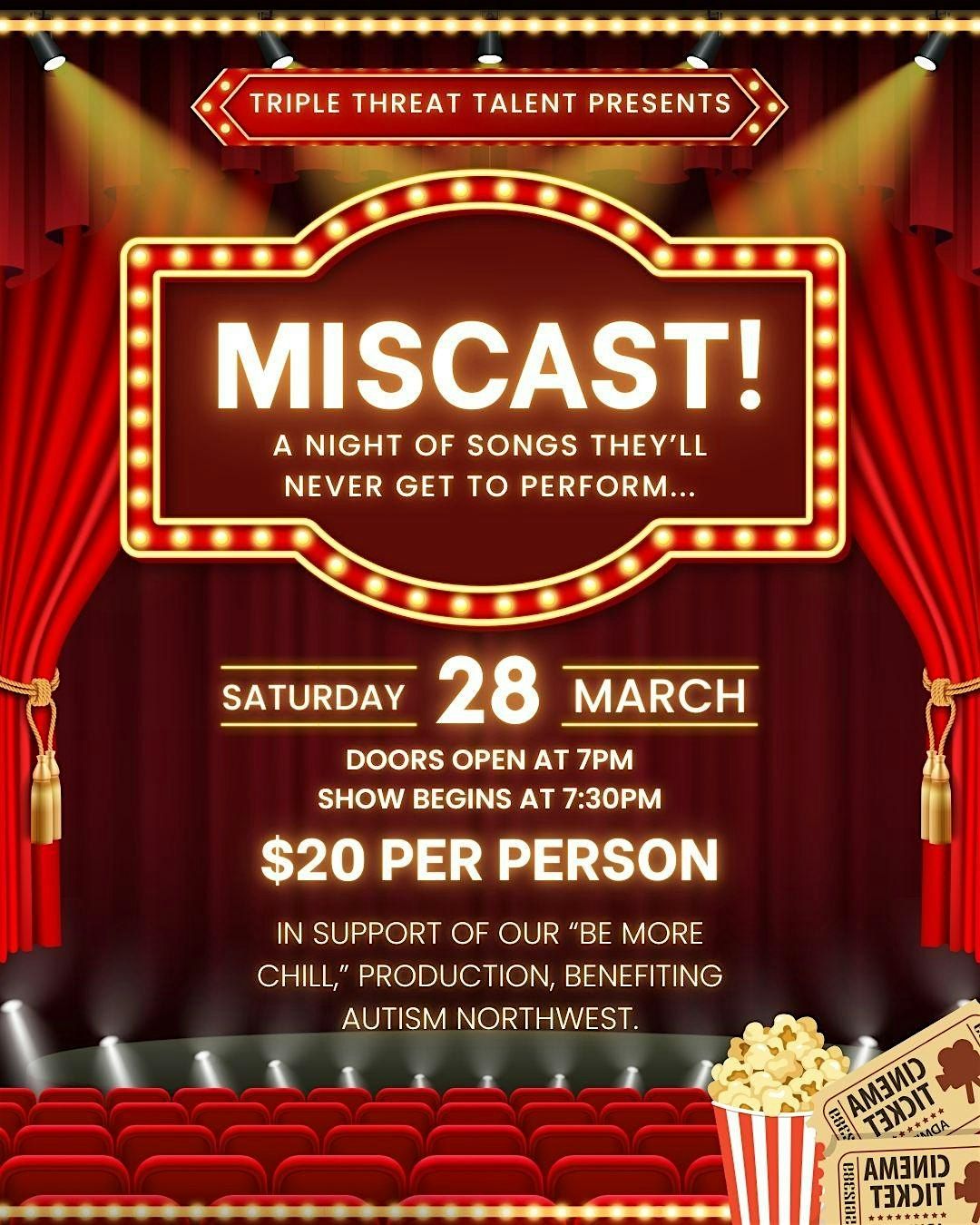 Miscast is a one-of-a-kind musical theatre showcase where performers throw casting rules out the window. Singers take on songs from roles they’d never traditionally be cast in—across gender, age, type, or style—resulting in bold, funny, and often surprisingly moving performances.