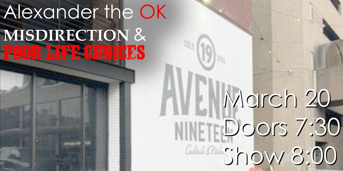 Welcome to MISDIRECTION & POOR LIFE CHOICES at Avenue 19! Get ready for a night of surprises and questionable decisions on March 20, 2026 at 8:00 PM (Mountain Time). It's going to be a wild ride filled with unexpected twists and turns. Don't miss out on the fun!