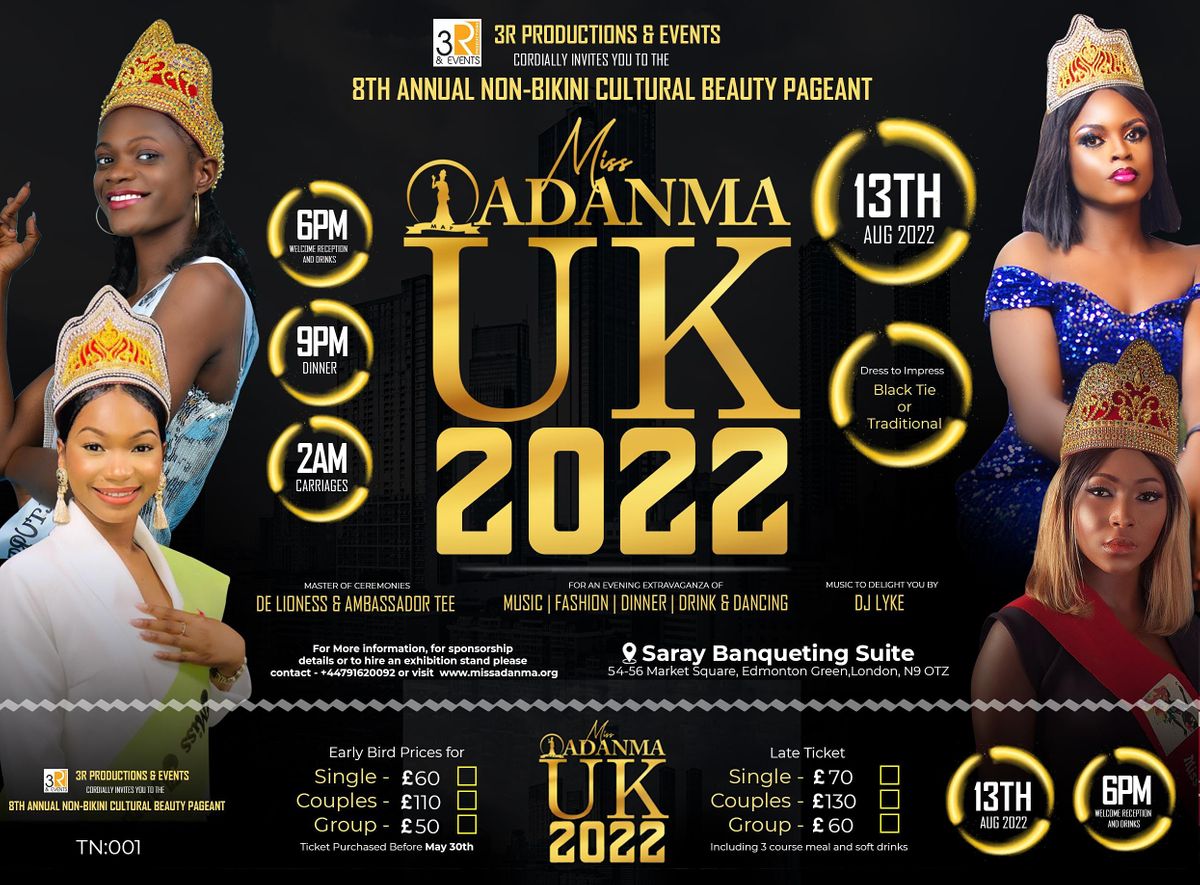 MISS ADANMA UK 2022Cordially invites you to the 8th annual non-bikini cultural beauty pageant. An evening extravaganza of dinner & fashion