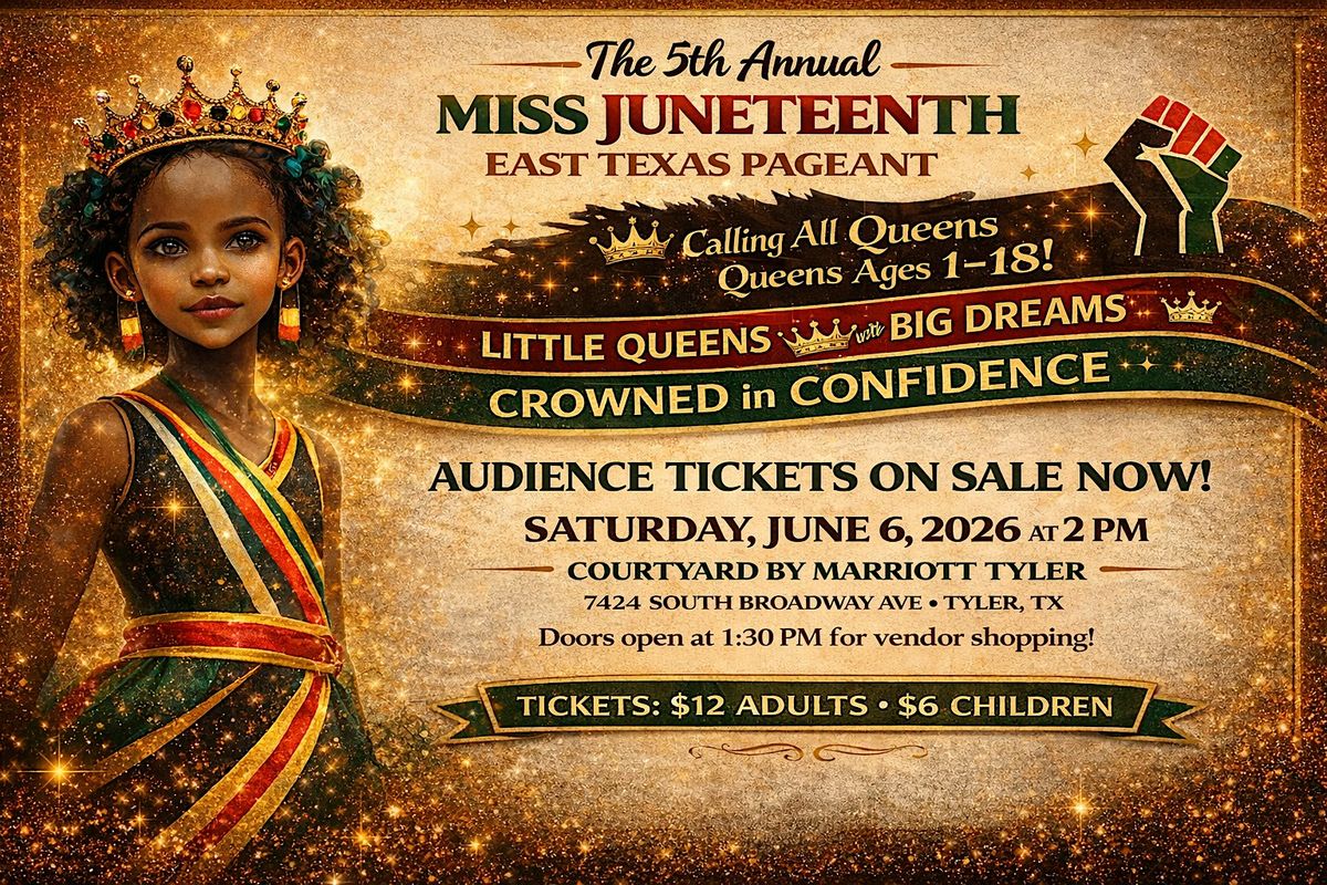 Support our young queens as they shine with confidence, beauty and purpose at Miss East Texas Juneteenth Pageant 2026. Ages 1-18
