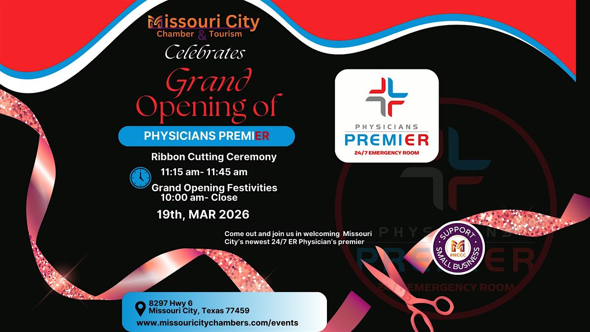 The Missouri City Chamber of Commerce is excited to welcome Physicians Premier Emergency Room 1 to the community! Join us for a special Grand Opening & Ribbon Cutting Celebration as we officially welcome Missouri City’s newest 24/7 Emergency Room. Come connect, celebrate, and help us show Chamber pride while supporting a new healthcare resource in our city. ✨