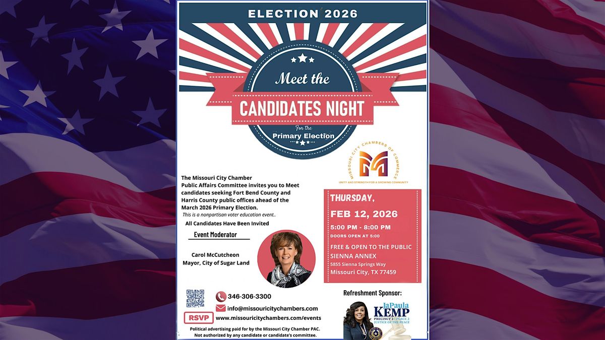 Join us for an evening of civic engagement and community discussion at the Missouri City Chamber's Meet the Candidates Night, with special guest, Carol McCutcheon