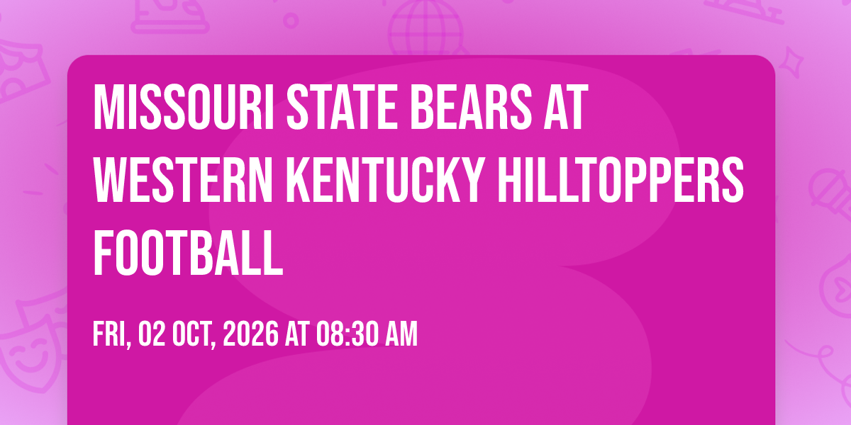 π Location: 36.9847, -86.4594π Welcome to Missouri State Bears at Western Kentucky Hilltoppers Football, where dreams come alive and possibilities are endless! ποΈ Join us at Houchens Industries-LT Smith Stadium in the heart of Bowling Green, KY for an event that defies expectations. π On October 2nd, 2026 at 08:30 AM, be part of something truly extraordinary as we bring together innovation, entertainment, and pure magic. β¨ Every aspect has been carefully designed to ensure an unforgettable experience for all our guests. Whether you're seeking adventure, inspiration, or simply a break from the ordinary, this event promises to deliver beyond your wildest dreams. π Prepare for a journey into the extraordinary!