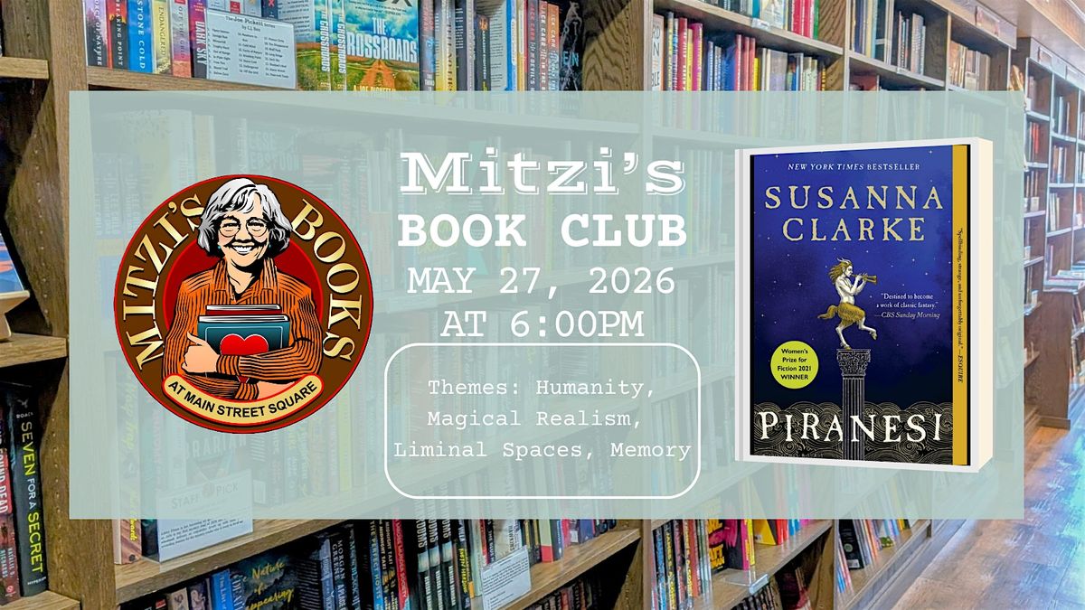 Join us at Mitzi's Books on May 27, 2026 at 6:00 PM (MDT) for a an evening diving into Piranesi by Susanna Clarke. Whether you’ve read the book or just love great stories, come hang out, share your thoughts, and enjoy some good company.