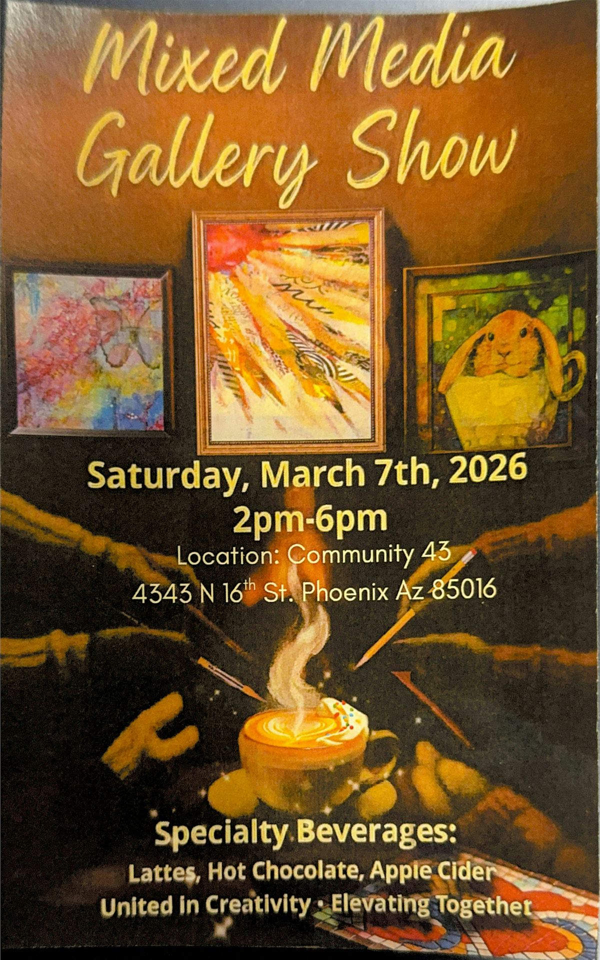 Come join us at 4343 N 16th St Phoenix, AZ 85016 for a mixed media art extravaganza. Come witness art from local artist that you'd be able to purchase and bring home to decorate your space. We also will be having tasty beverages such as Lattes, Hot Chocolate, and Apple Cider. We are United in Creativity. Elevating Together.