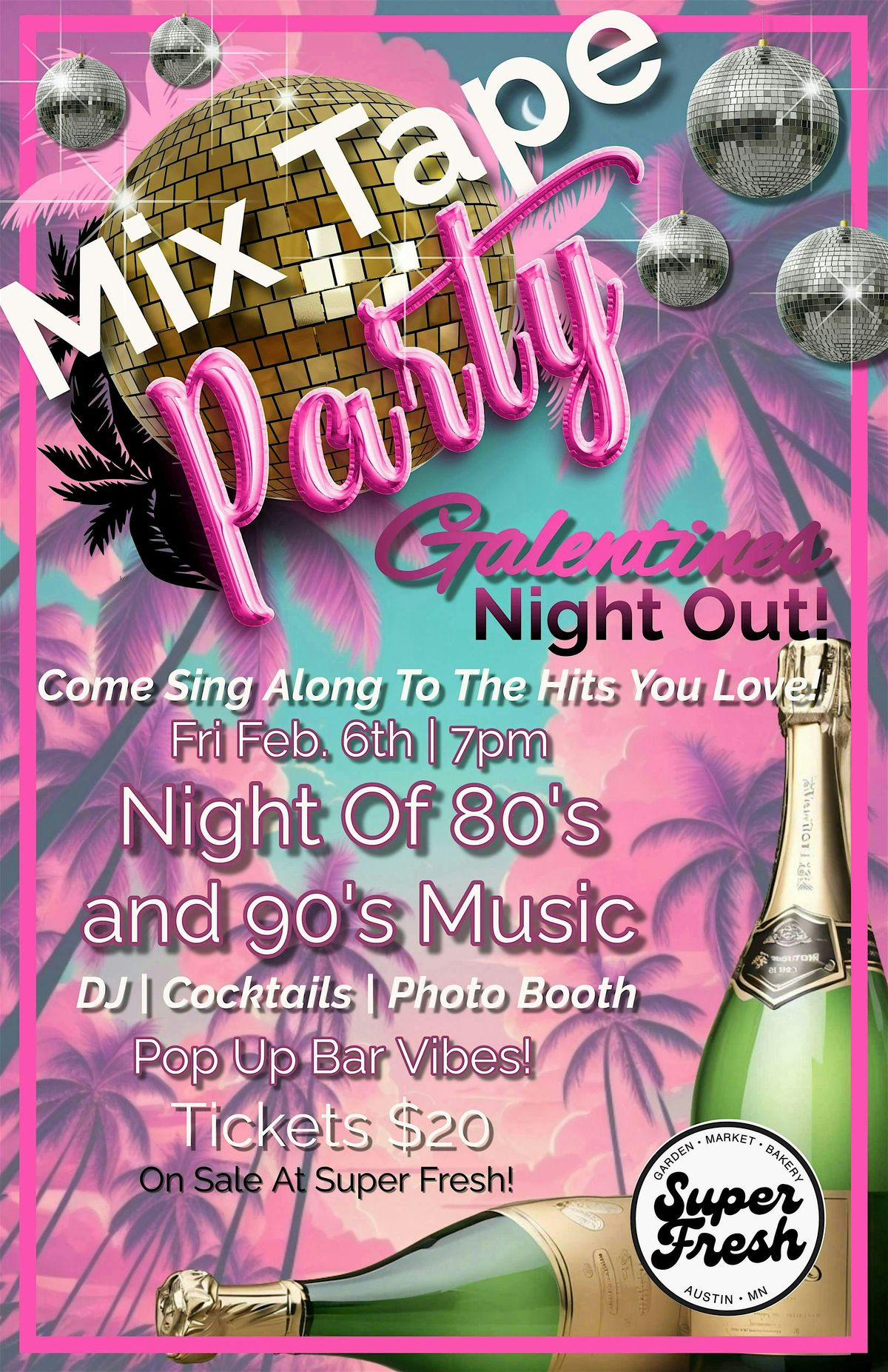 Beat the winter blahs with your gals at a totally rad night of 80s & 90s sing-alongs! Super Fresh is SO excited to bring you our first Mixed Tape Sing-Along/Karaoke Night — think disco balls, lots of pink, palm trees, and pure nostalgia. Dust off your favorite playlists and get ready to belt out the classics with your crew.