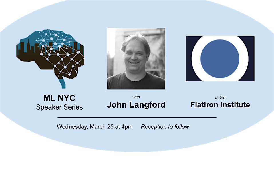 The ML in NYC Speaker Series + Happy Hour is excited to host John Langford from Microsoft Research as our February speaker! His talk will take place Wednesday, March 25 at 4pm at the Flatiron Institute. As always, there will be a reception afterward for all attendees.