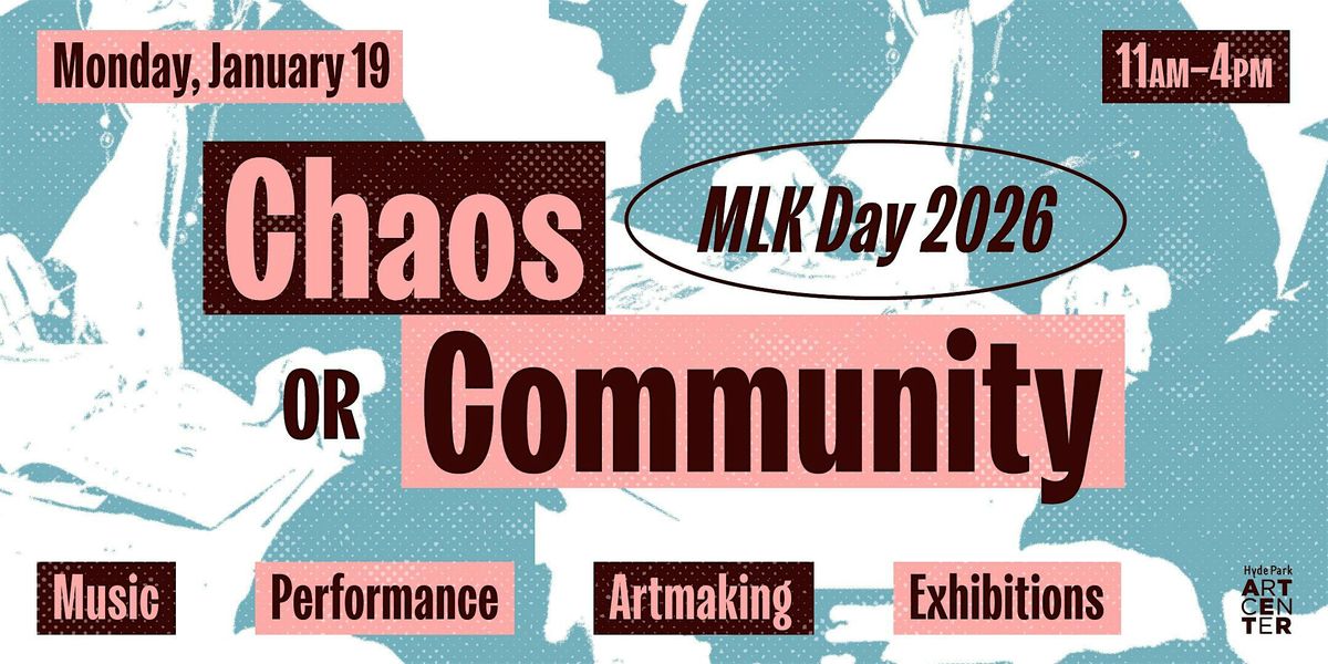 Hyde Park Art Center proudly presents a free public Martin Luther King Jr. Day celebration MLK DAY 2026: CHAOS OR COMMUNITY on Monday, January 19, from 11 AM – 4 PM at 5020 South Cornell Avenue. Eclectic programming for all ages blends live music, thought-provoking film, artmaking, and meditation, to highlight art as a vessel for collective memory, liberation, and joy, while reflecting on Dr. King’s profound impact on social justice and cultural movements. Registration is recommended at HydeParkArt.org.