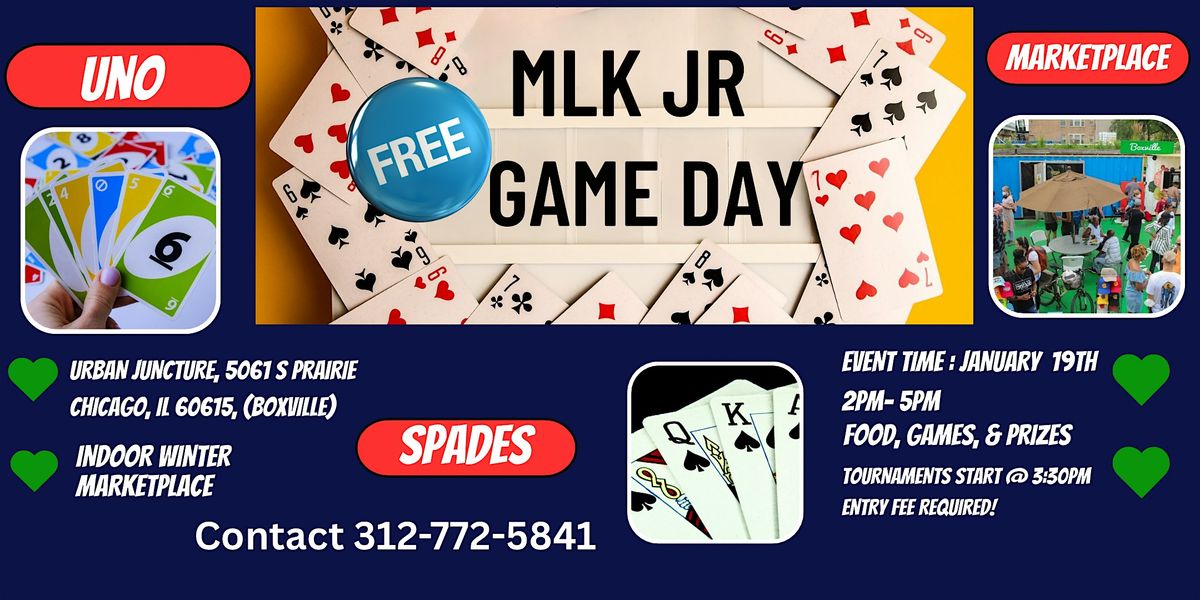 Get ready for a fun-filled day at our indoor marketplace MLK JR GAME DAY! Show off your skills in Spades and UNO tournaments, meet new people, and enjoy some friendly competition. Come enjoy the Boxville vibe while shopping with our small businesses, good food, and music. Whether you're a card shark or just looking for a good time, this event is perfect for everyone. Don't miss out on the laughs, good energy, and prizes. See you there!