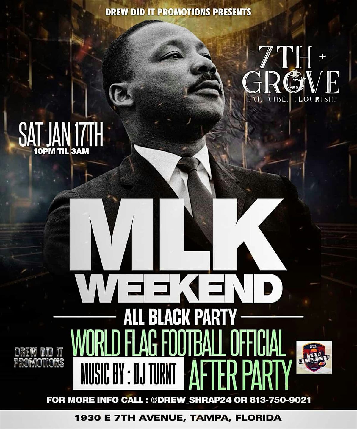 Drew Did It promotions is bringing you the Biggest MLK Weekend "ALL BLACK PARTY" in Tampa Bay at 7th and Grove in beautiful Ybor City. Get your tickets and sections ASAP. For more info call Drew at 813 750 9021 βοΈ
