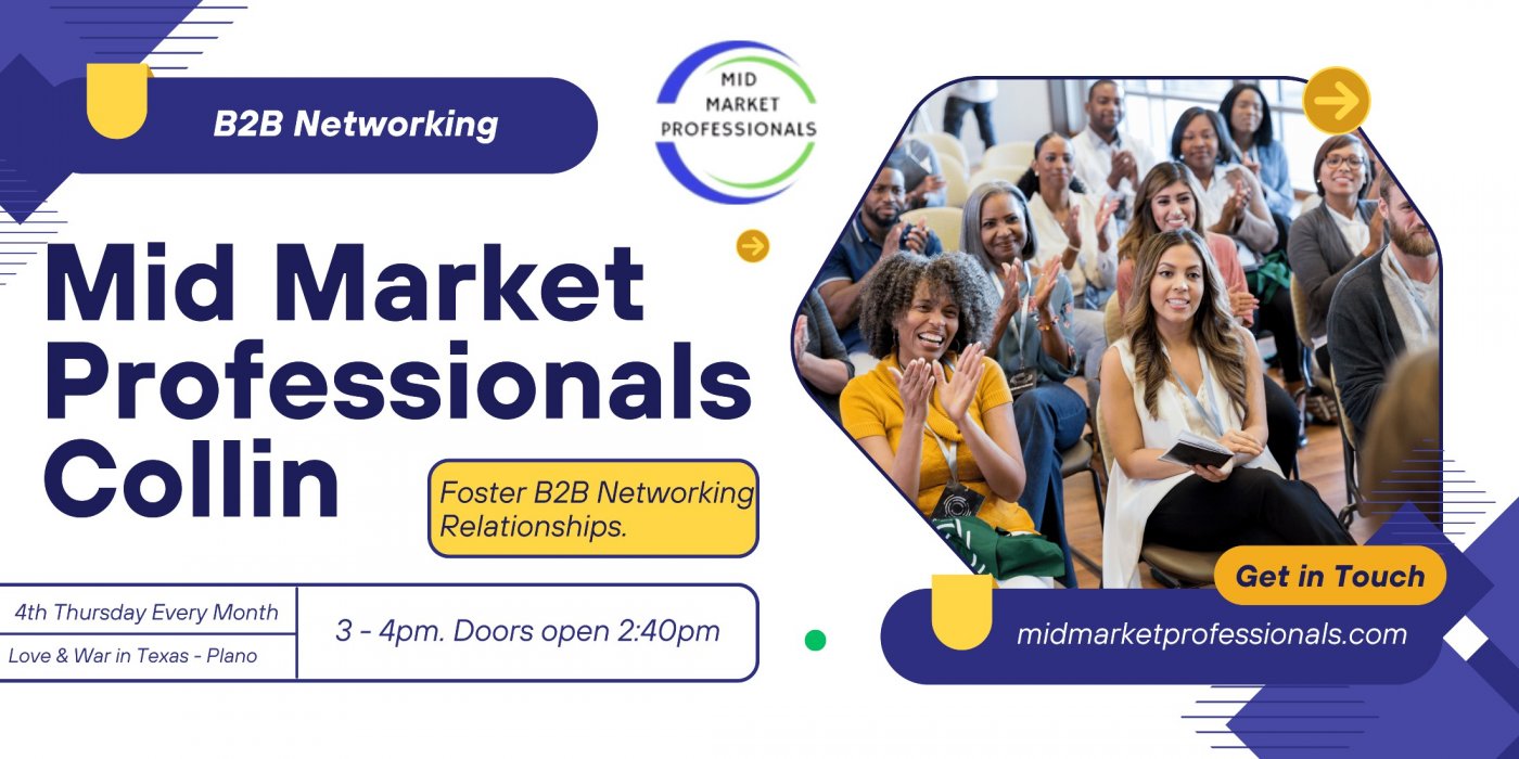 Mid Market Professionals COLLIN: Where Innovation Meets Interaction! At Mid Market Professionals COLLIN we're passionate about the potent power of networking. We've carefully crafted this event to connect clever B2B networkers (not B2C) who reside work or target businesses in Collin County.