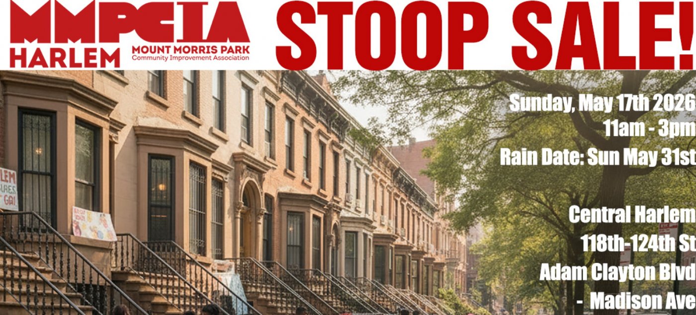 On Sunday May 17th 2026, the Mount Morris Park Community Improvement Association is proud to host the annual Community Stoop Sale in Central Harlem. Over 100 homes are expected to participate in this year's 1-day event over an area stretching from Madison Avenue to Adam Clayton Powell Blvd (7th Ave), and from 118th Street to 124th Street.