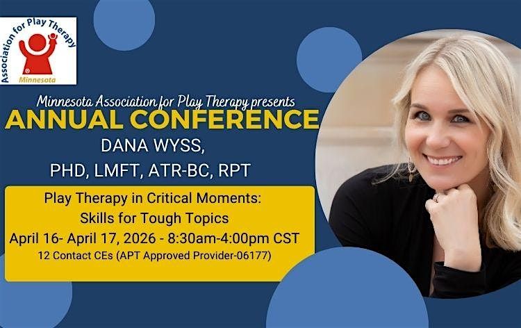 Join us in Minnesota for our annual PLAY THERAPY conference. This year, our presenters is Dana Wyss, PhD, LMFT, ATR-BC, RPT who will be speaking on the topic of Play Therapy in Critical Moments: Skills for Tough Topics in this two day conference!