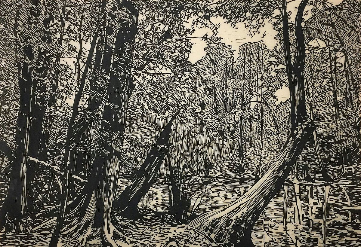 Image: Jennifer Basile, Congaree, 2016. Hand-printed relief print on Japanese rice paper. Gift of the private collection of Michael Joseph Netsky.