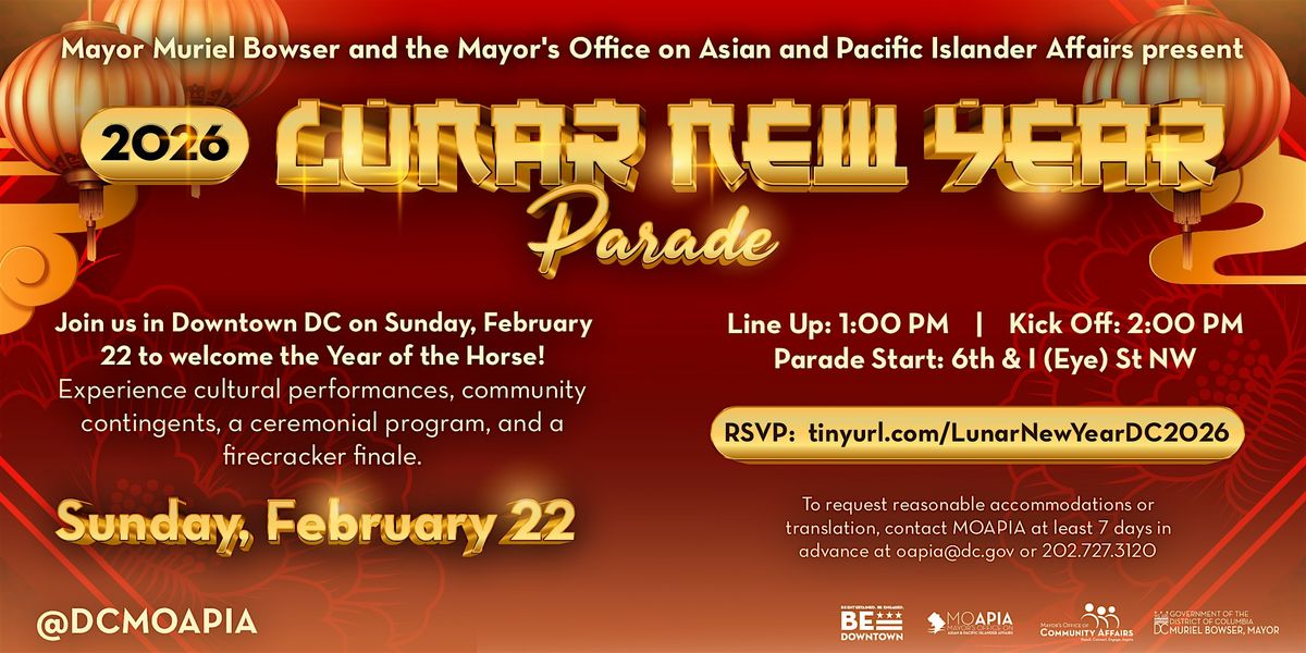 Walk with Mayor Bowser and the Mayor's Office on Asian and Pacific Islander Affairs (MOAPIA) in the 2026 Lunar New Year Parade on Sunday, February 22nd. Enjoy vibrant cultural performances, a special ceremonial program, and a dazzling firecracker finale.