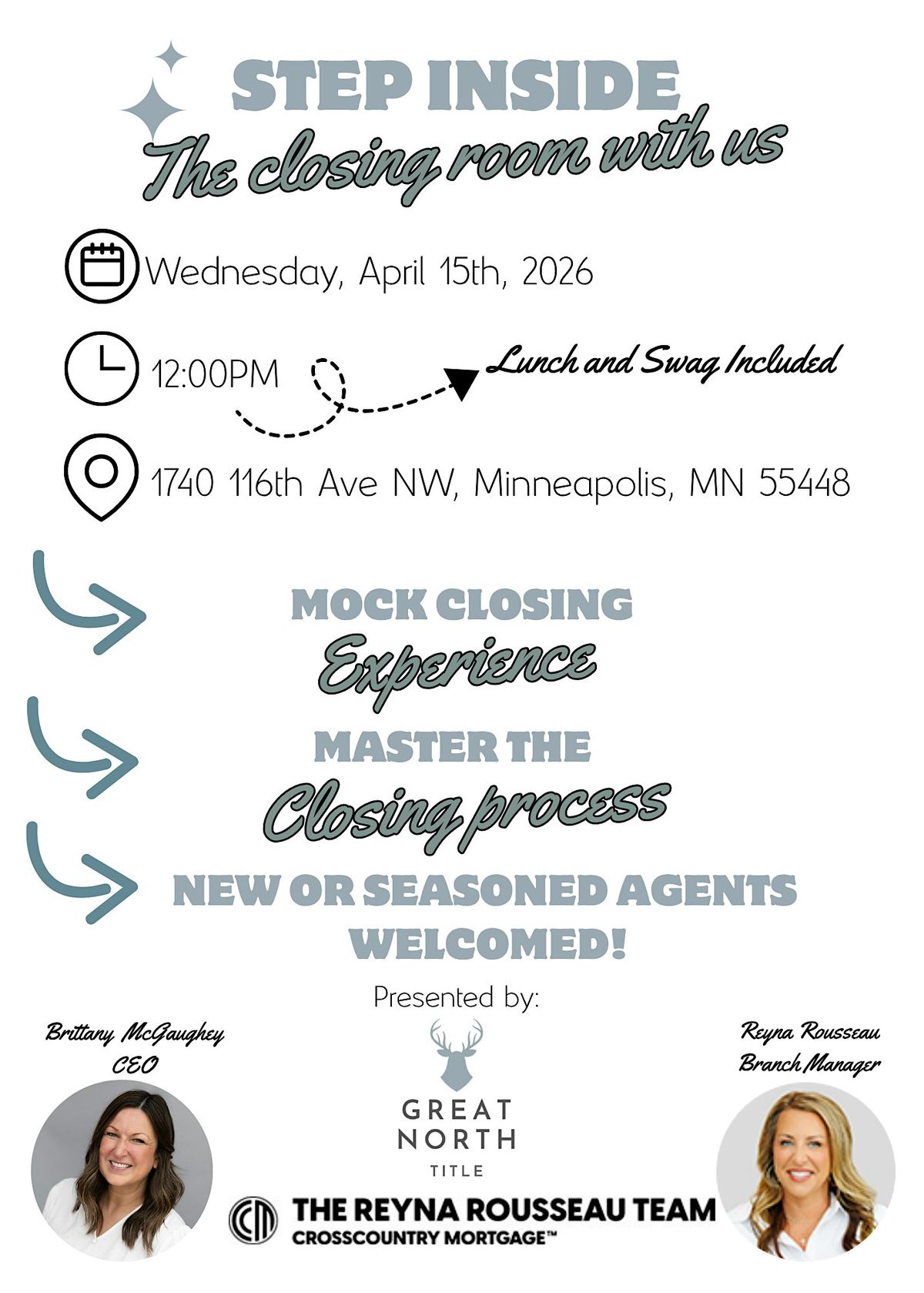 Join us in person for a hands-on experience with a Mock Closing. This event is perfect for anyone wanting to see how closing a deal really works, minus the stress. It's casual, informative, and a great way to get comfortable with the process. Don't miss out!