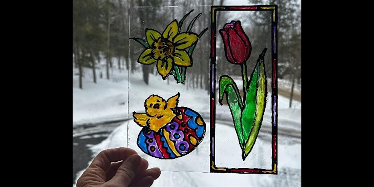 Create the look of stained glass without the cutting, heating and joining! “Lead” is created first with special paint in a nozzled bottle that allows the artist to trace a pattern onto Plexiglass. Different sizes of Plexiglass squares and rectangles will be provided, as will a variety of line drawings for tracing or inspiration. After a brief drying period, compartments within the design are filled with colorful stained glass paints that dry translucent and hard after 24 hours: a beautiful and bright window on the awakening world!