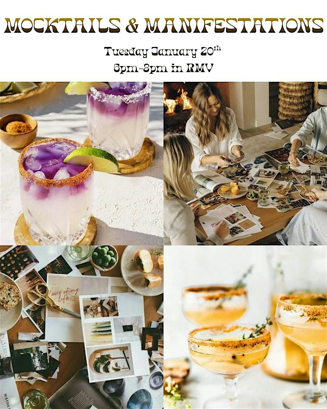We'll sip on some refreshing mocktails while setting intentions and manifesting our dreams through a fun visionboarding project. It's the perfect opportunity to relax, connect with like-minded individuals, and visualize the life you desire.