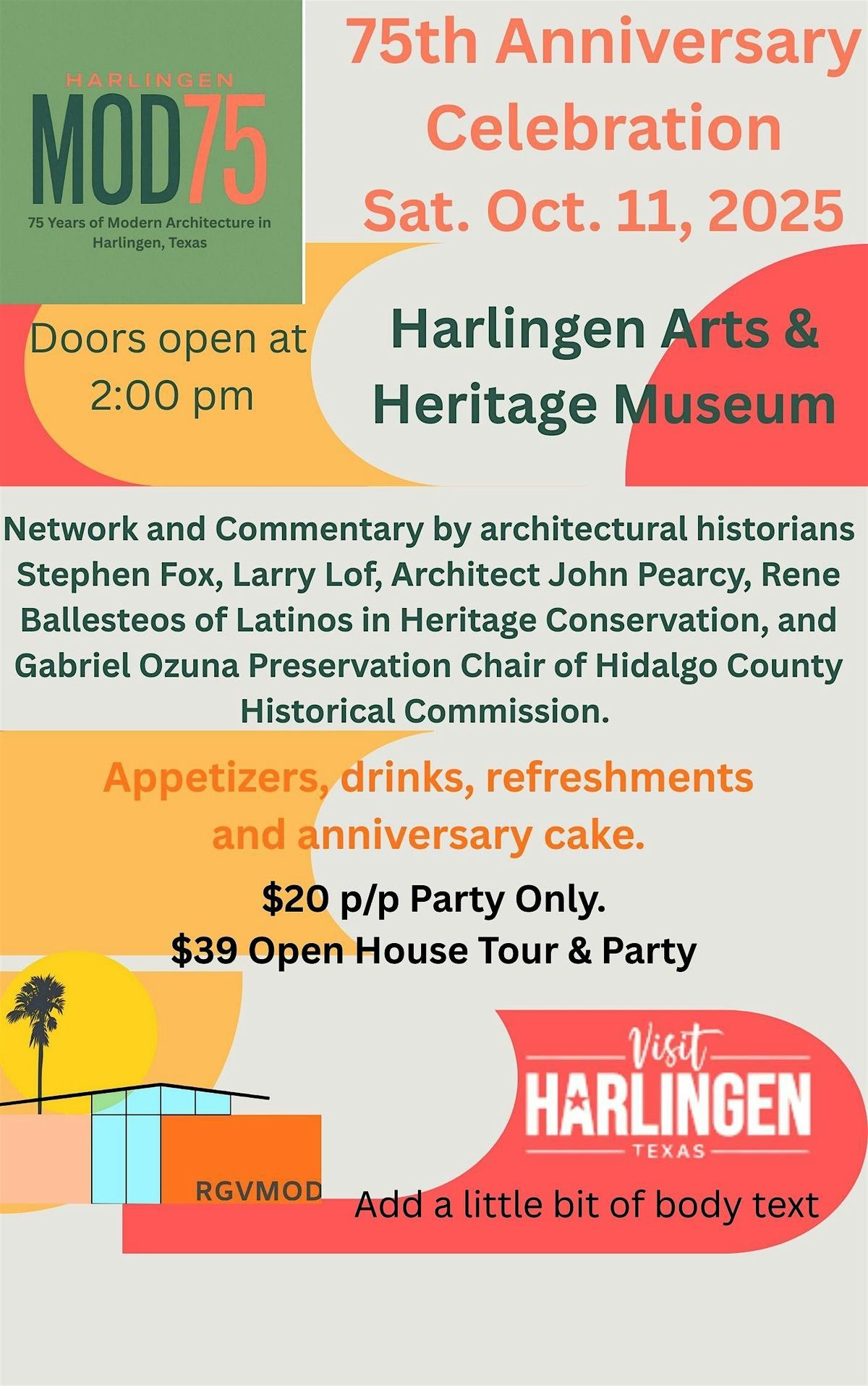Come celebrate 75 years of Modernism in Harlingen. Mingle with midcentury modern enthusiasts, and enjoy expert commentary on architectural preservation and the importance of the Modern architectural style in Harlingen and the Rio Grande Valley. Drinks, appetizers, cake and lots of fun. Don't miss it.