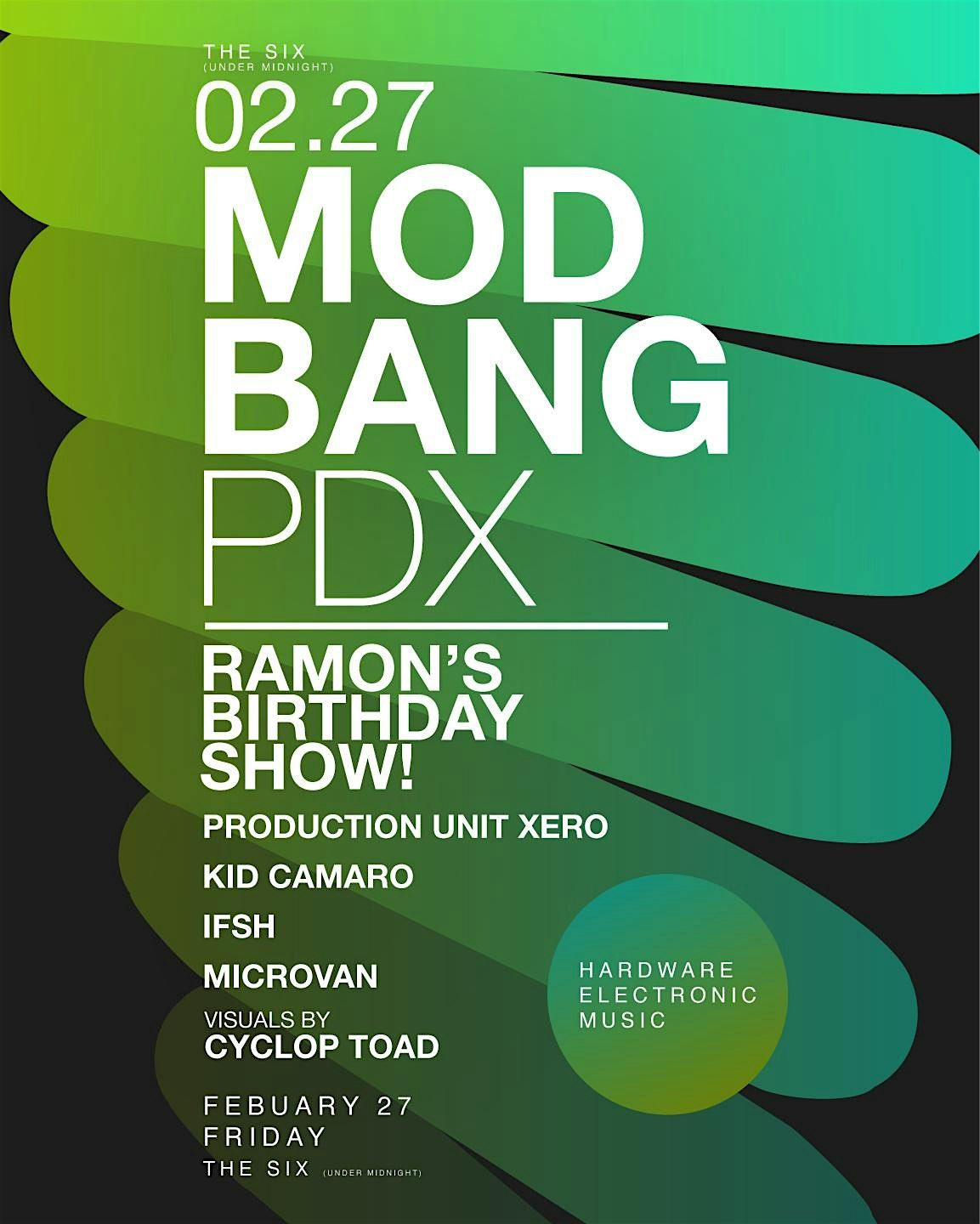 MODBANG PDX returns to The Six with a stacked night of live hardware electronic music, celebrating Ramon’s birthday in proper underground fashion. This edition brings together some of Portland’s most forward-thinking synth artists, modular heads, and machine-driven performers for a deep dive into analog sound, pulse, and texture.