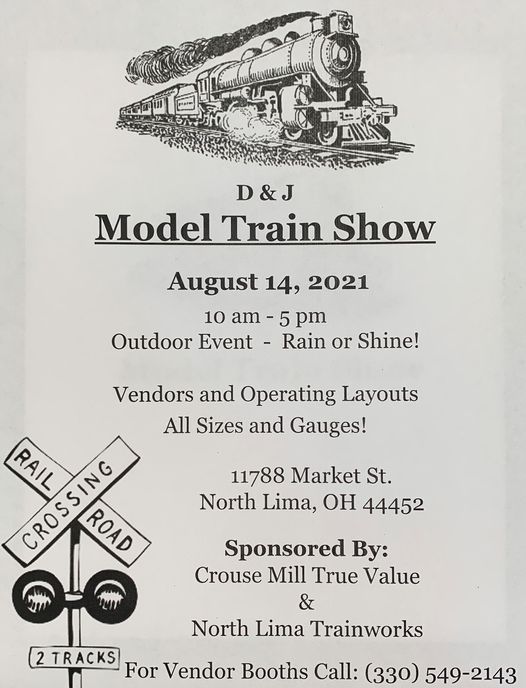There will be vendors and operating layouts of ALL sizes and gauges of trains. The show is sponsored by Crouse Mills Hardware Store and North Lima Trainworks, located in North Lima Ohio. This will be an outdoor event under tents located in the yard between the two business'. Rain or Shine, the show will start at 10 am and go until 5 pm on August 14, 2021.If you are interested in being a vendor, please give us a call at
